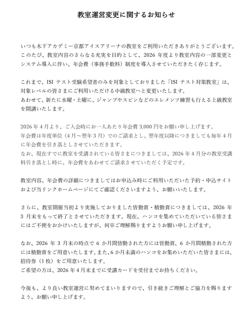 今後も皆様により良いレッスンを提供できるよう努めてまいります。 引き続き、ご理解とご協力を賜りますようお願い申し上げます 。
